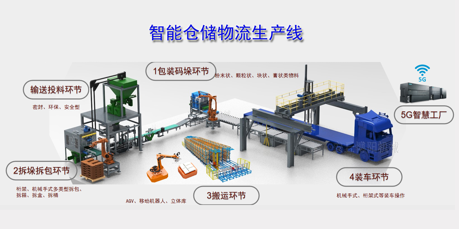自動配料投料系統→全自動包裝機→碼垛機器人→AGV出入庫系統→自動裝車機生產線